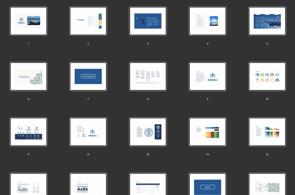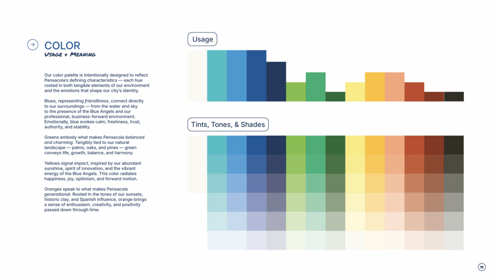 This visual identity relies more heavily on supporting graphics like patterns, icons, badges, photography, and other design elements to tell the Pensacola story.